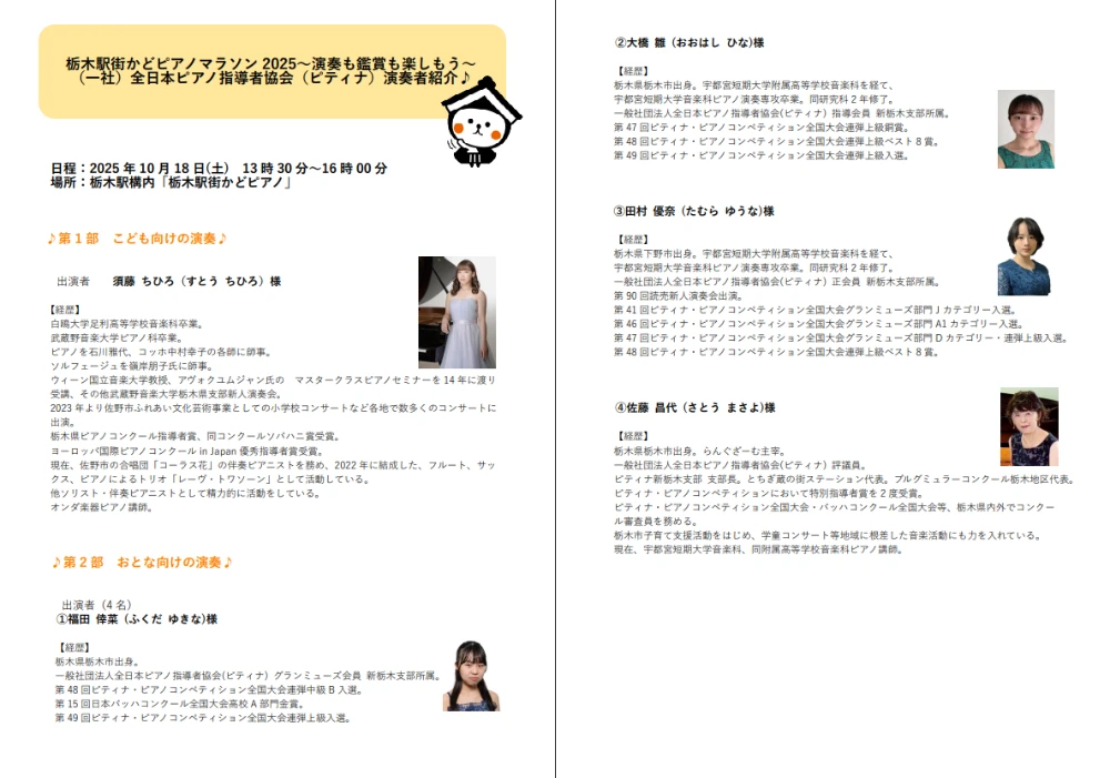 今回は、公募による9名の参加者に加え、ピティナ栃木支部と新栃木支部からゲスト演奏者を迎え、より多彩なプログラムが実現しました。